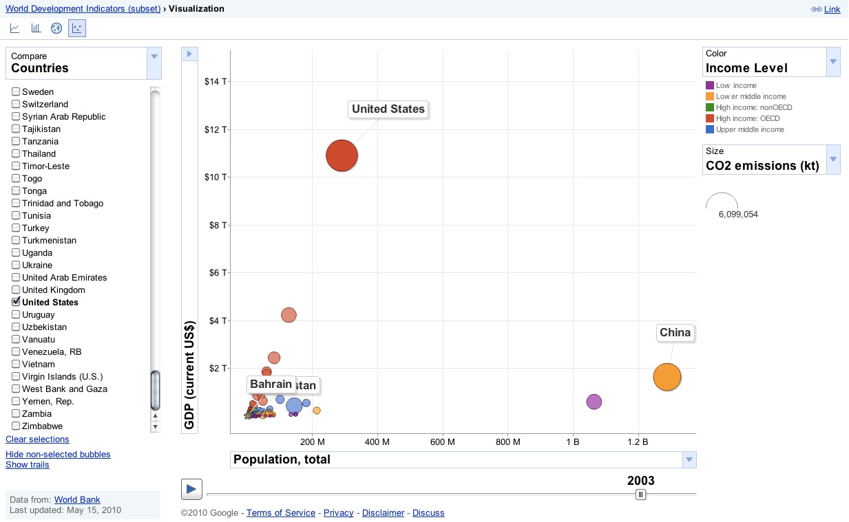 Google实验室的Public Data Explorer(公共数据浏览器)是以官方数据为基础,为一些常见的搜索请求制作图表,以更加直观的视觉形式反映搜索结果。强大的多维度图表系统提供了多维度的数据载体,XY轴、颜色、体积都可以附加关键的信息,这样便可以同时观察好几组数据,去发现他们之间的关系,了解趋势性信息。公共数据浏览器由Google与世界银行等数据统计机构合作推出。以下的浏览的截图。