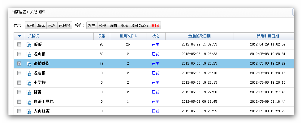 通过构建统一的关键词库,对关键词被引用的次数和权重做分析,可以获取到最近的热点事件,有利于编辑在内容选择上做出合理判断。通过TideCMS发布的文章,编辑即可以手工添加关键词,也可以由系统自动提取关键词(自动分析内容结构提取关键词),并且所有文章涉及的关键词都会自动入库并做权重和热门分析。