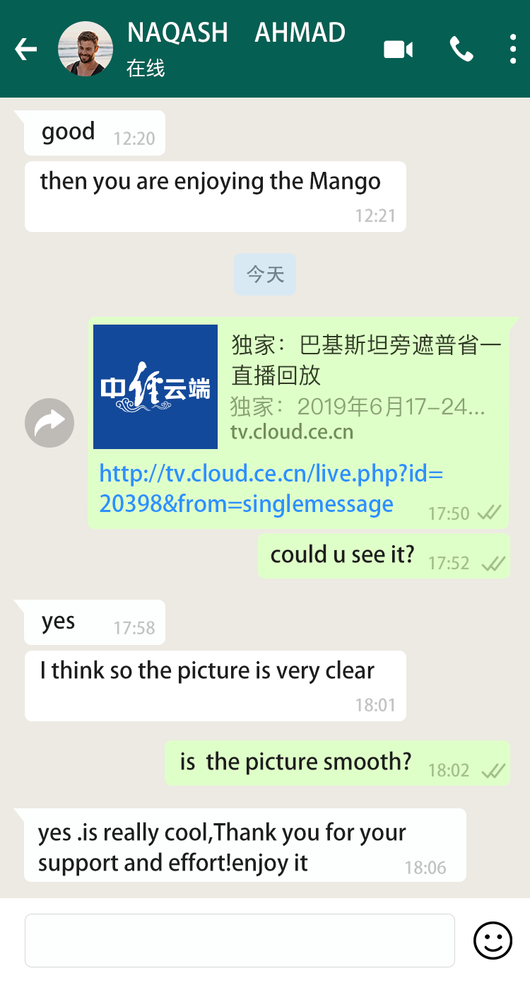 聚现新型直播技术推出的同时,也全面开通海外业务,实现海外直播。在中国经济网摄制组深入巴基斯坦直播“巴基斯坦芒果日”活动中,聚现全程提供技术支持,实现海内外同步直播观看,打破区域限制,高清低延时。直播观看体验受到巴基斯坦当地观看用户的一致好评。