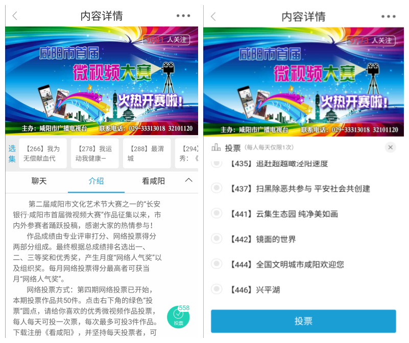 近期,咸阳广播电视台举行“咸阳市首届微视频大赛”,采用网络投票形式。聚现云服务平台互动投票全程支持,共有446个微视频作品参赛,观众积极为自己喜欢的作品拉票、投票。