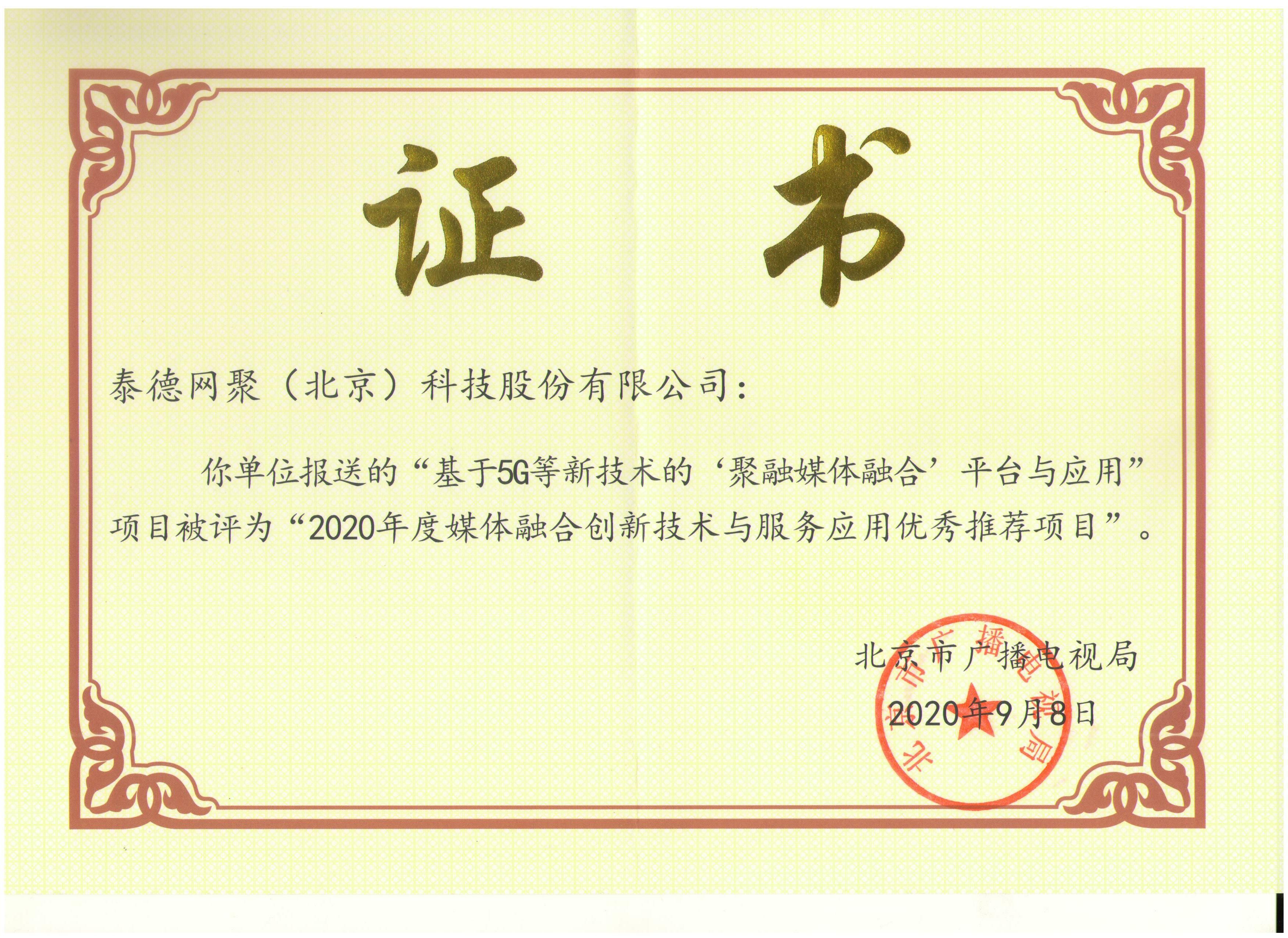 泰德网聚(北京)科技股份有限公司在中国广电媒体融合发展大会中荣膺“2020年度媒体融合创新技术与服务应用入库优秀推荐项目”奖项。