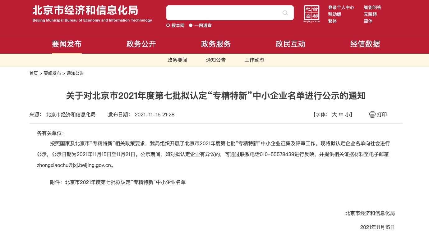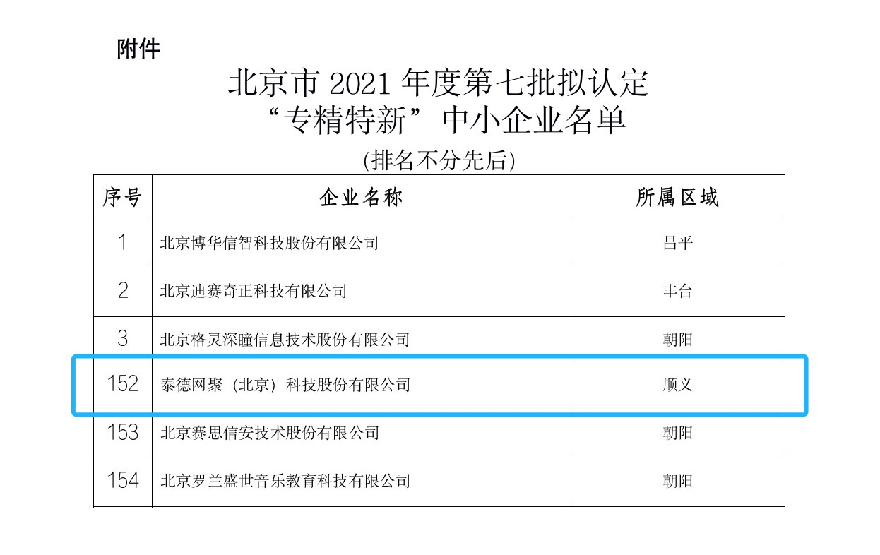 日前,北京市经济和信息化局公布了2021年北京市“专精特新”中小企业名单,泰德网聚(北京)科技股份有限公司通过申报和评审,成功入选北京市“专精特新”中小企业名单。这是泰德网聚的荣耀,也是对公司突出贡献和优异成绩的肯定。