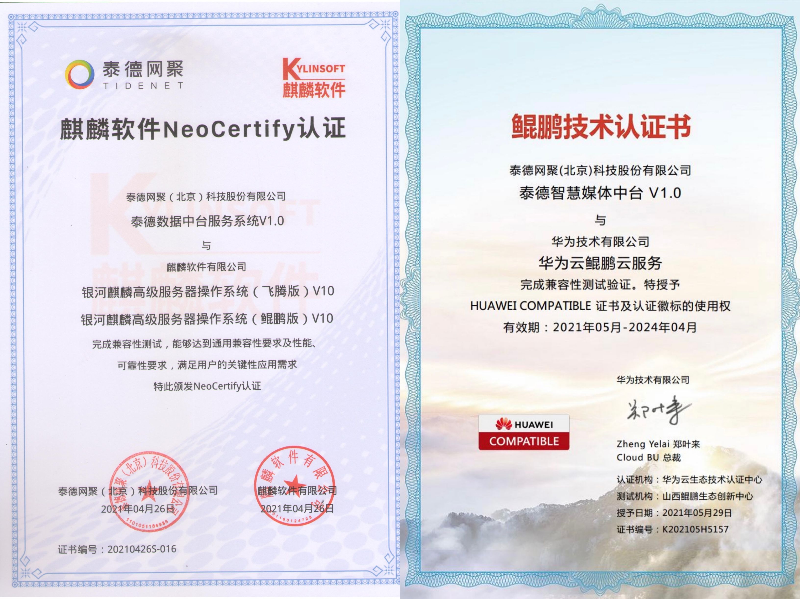 近日,由泰德网聚(北京)科技有限公司自主研发的“泰德数据中台服务系统”和“泰德智慧媒体中台”产品分别通过银河麒麟NeoCertify认证与华为鲲鹏技术认证。认证期间,技术人员与麒麟软件公司和鲲鹏生态创新中心多次沟通,进行了大量深度测试与反复验证,最终完美解决了测试中遇到的各类技术难题,顺利完成兼容性测试并获得认证证书。