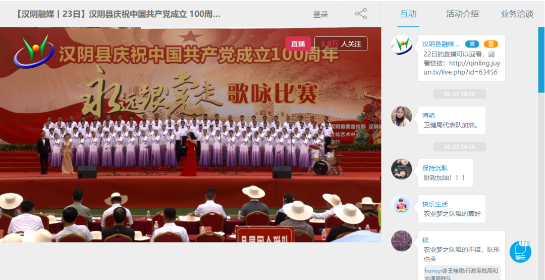 近月来,聚现媒体云服务平台为226个相关主题的活动提供支撑,进行全程直播和全网分发。这些活动使用了聚现媒体云服务平台的推流、拉流、点播、导播台、活动分发、评论互动、抽奖、问答、添加广告位等功能,最大程度提升了活动的传播力和影响力,将观看用户与活动紧密围绕在一起,让观看用户通过直播活动更深刻的认识到,只有在我们党的领导下,走中国特色社会主义道路,才能实现中华民族的伟大复兴。