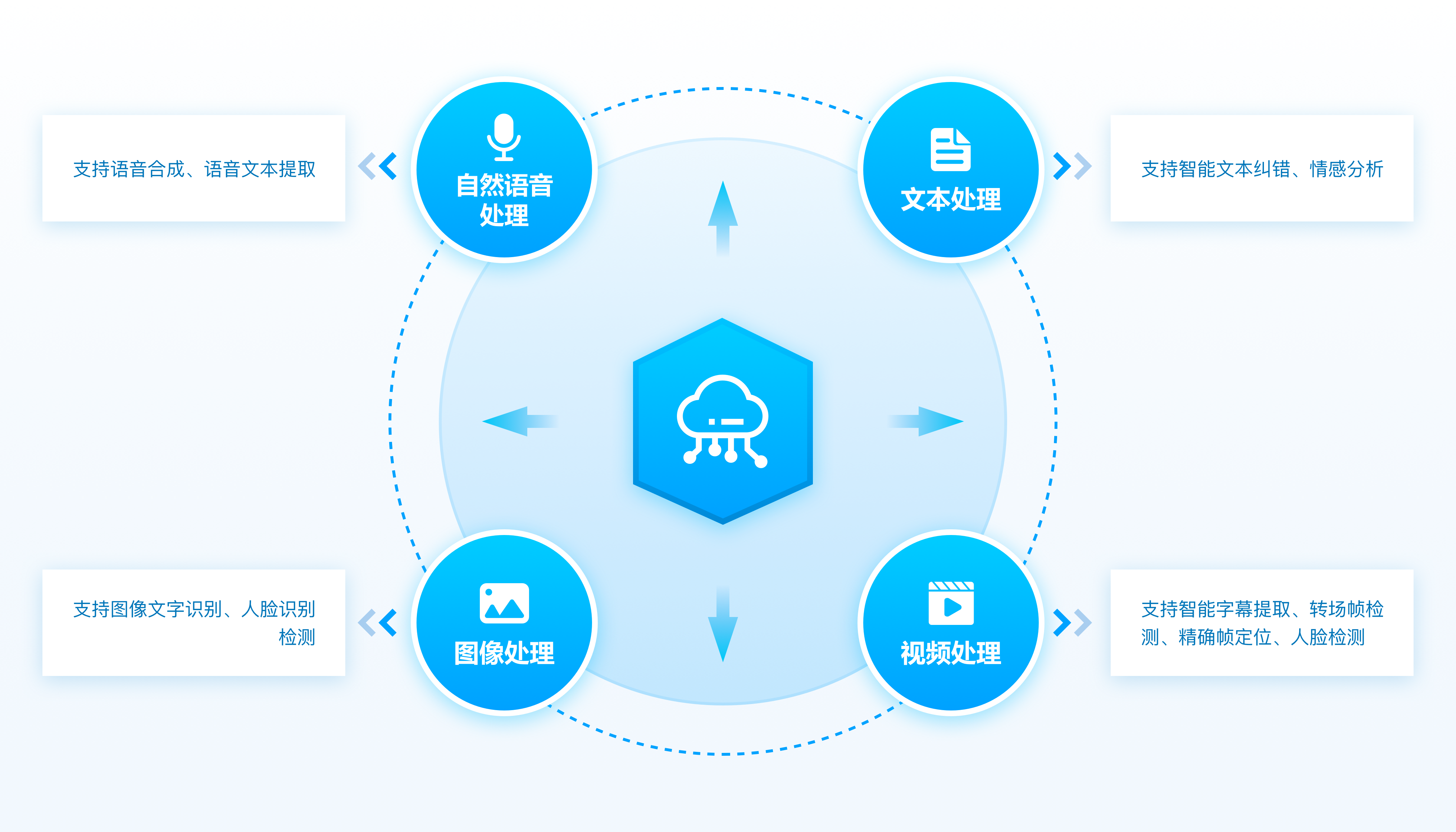 支持语音合成,将文本合成为指定的人声音频文件,可用于智能非编内容处理;支持语音文本提取,将音视频中的人声提取为文本内容,可用于智能非编内容整合,媒资内容智能分类搜索等。