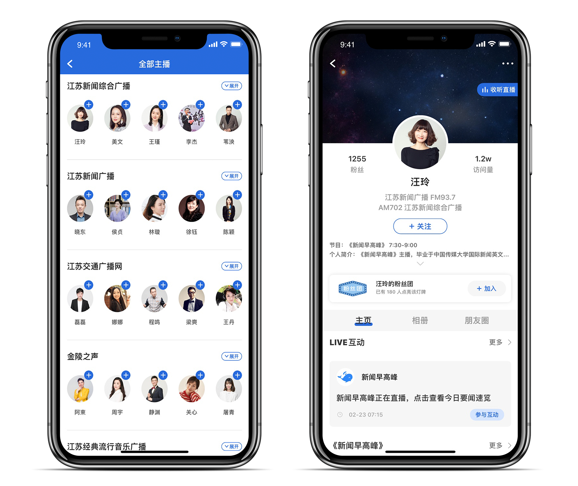 大蓝鲸APP是基于泰德网聚“聚视”APP“生产平台打造的融媒体移动视听互动平台,大蓝鲸APP邀请江苏广播的主持人进行平台入驻,为主持人开通个人主播号,更新节目动向及生活日常,吸引了大批粉丝的关注及互动。