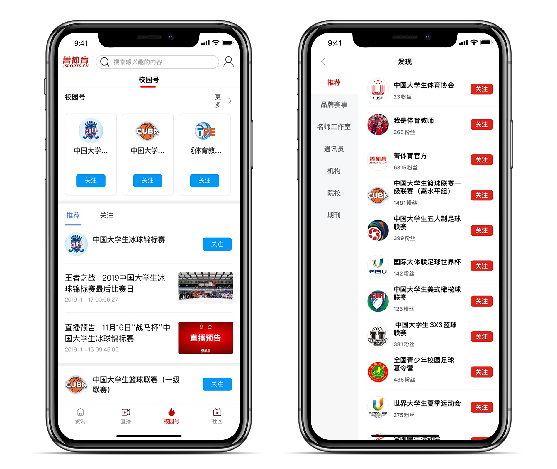 菁体育APP是新闻社交类移动应用APP,下设各类校园号,提供校园体育资讯、赛事直播、课程培训等诸多功能。