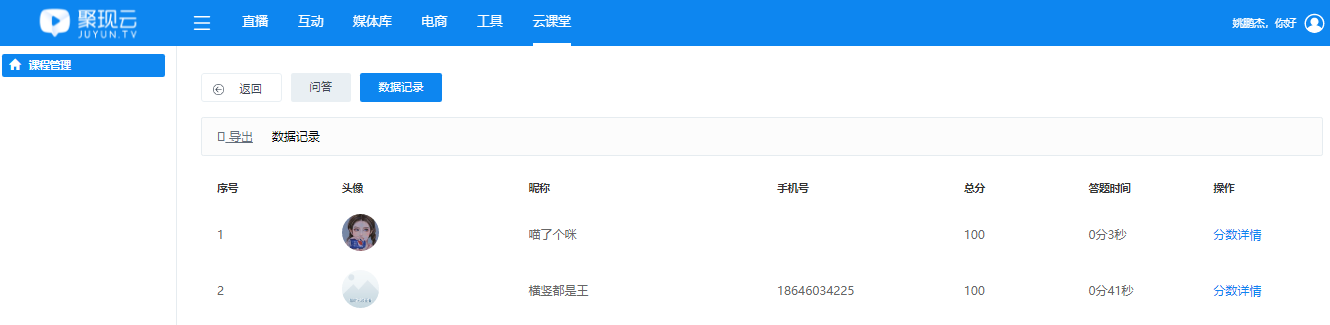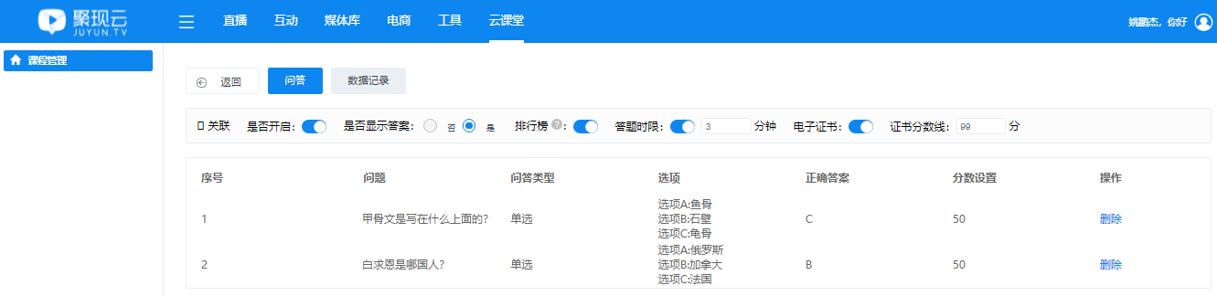 讲师端支持设置多种题型,支持自定义题目分数和考试时间,学员答题后,后台实时显示学员答题选项及得分。