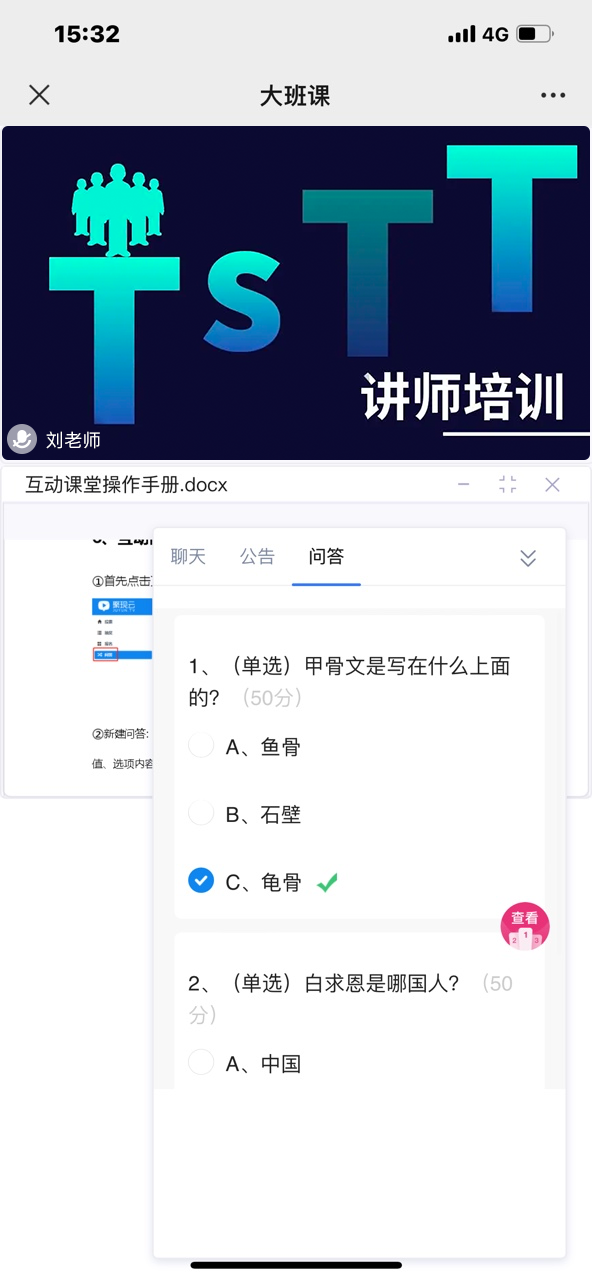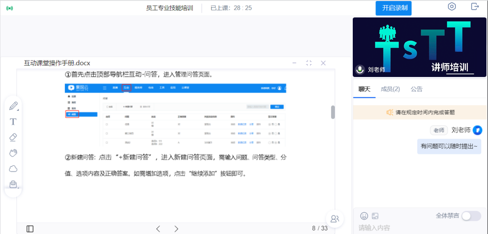 学员在聊天框内发送的文字和图片,能够实时显示在讲师端,可随时进行提问与答疑。讲师端支持设置公告,实时显示在学员端,重要信息一目了然。