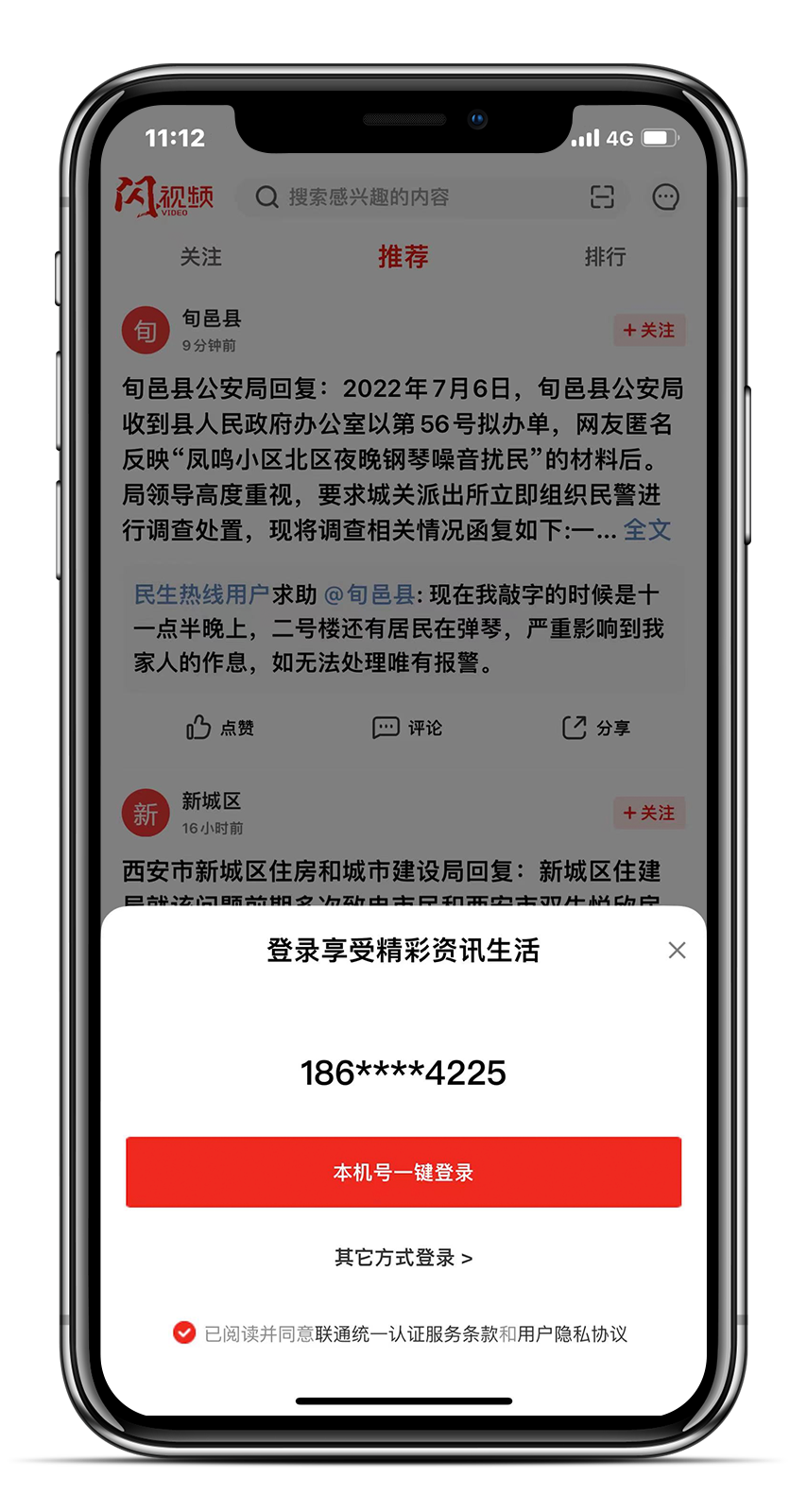 [未登录、无关注状态时,显示推荐关注的媒体号,登录支持本机号码一键登录,关注的媒体号发布的最新信息支持实时展示,用户可进行点赞、评论、分享交互操作。]
