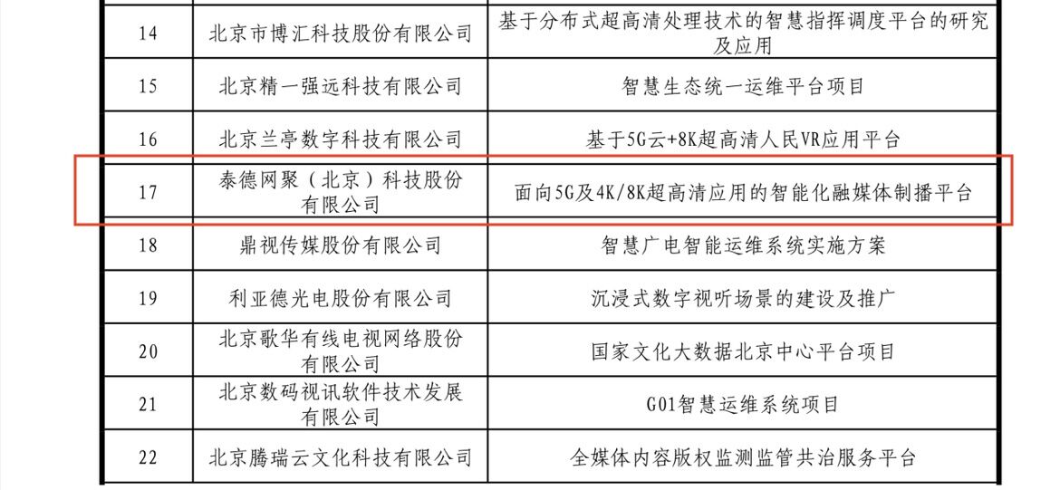北京市广播电视局日前宣布“2023年北京市推动智慧广电发展专项资金奖励项目”名单,泰德网聚荣幸入选,获评“2023年北京市推动智慧广电发展专项资金”重点奖励项目。此殊荣代表着泰德网聚在数字化领域的杰出成就,以及在广电行业内受到的专业认可。