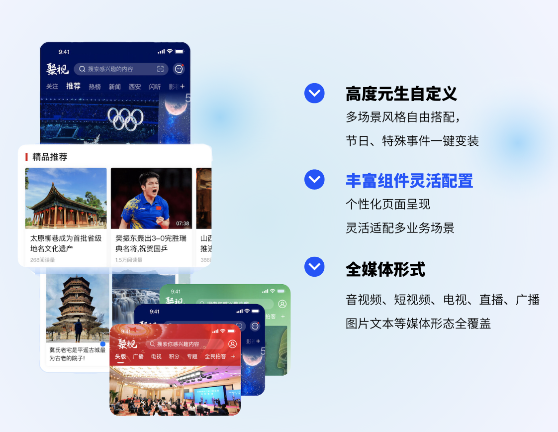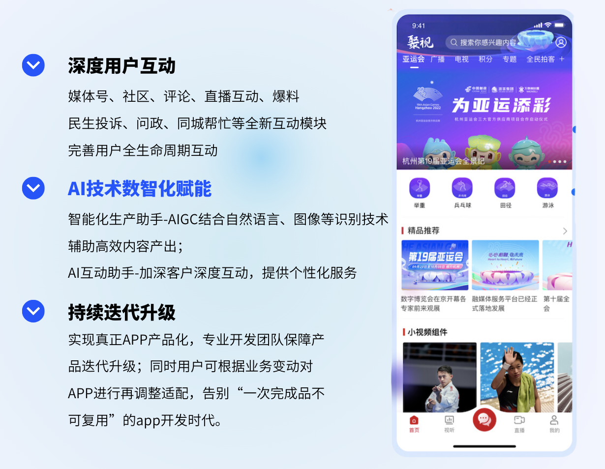 基于泰德网聚核心低代码开发技术进行开发,聚视新媒体客户端运营平台,融合前沿AI技术以高灵活数智化重新定义APP开发,可实现低成本快速交付、全端内高度原生自定义、高效内容分发等功能优势,打造“媒介移动化、内容多模态化、传播智能化、运营数智化”的全新新媒体运营传播模式。