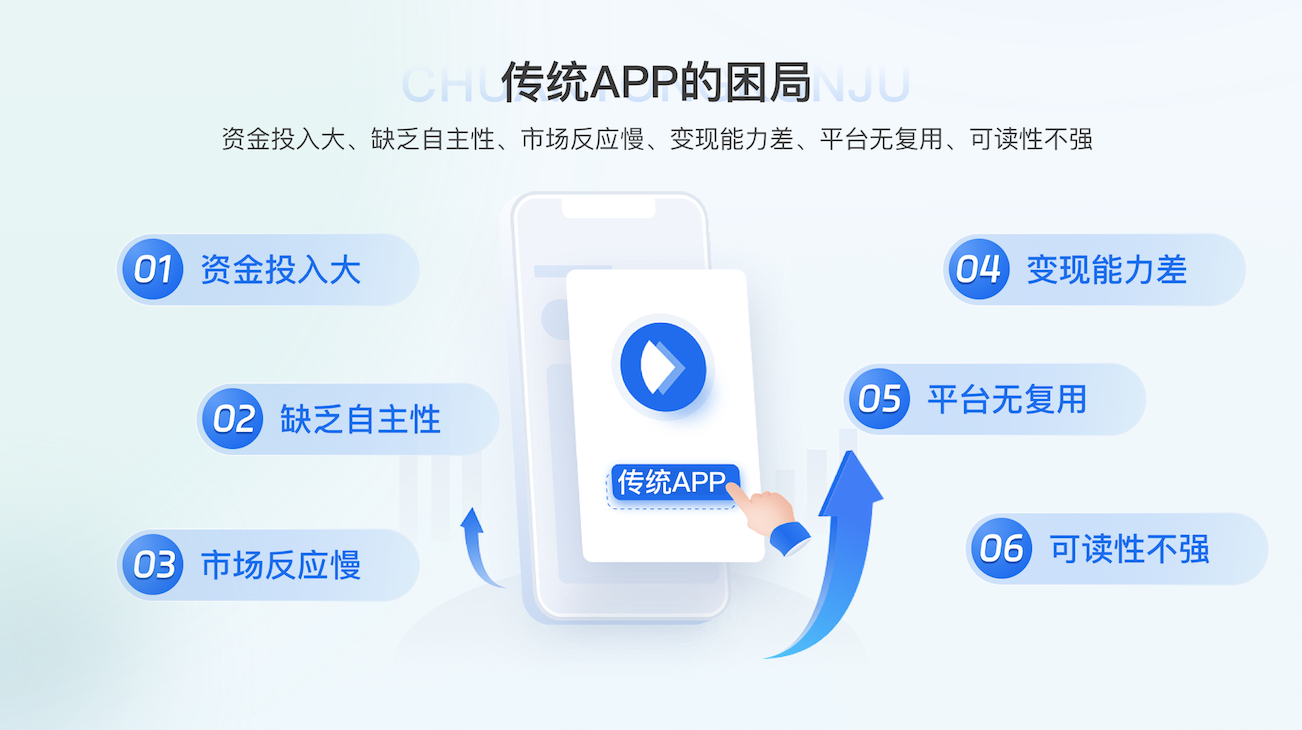 在传统的APP开发模式中,成本高、开发周期长、内容分发效率低等问题是常见的“建设困局”。随着移动互联网的不断发展,用户对APP的需求也变得更加多样化和个性化,传统的开发方式已逐渐无法满足数智时代的新需求。