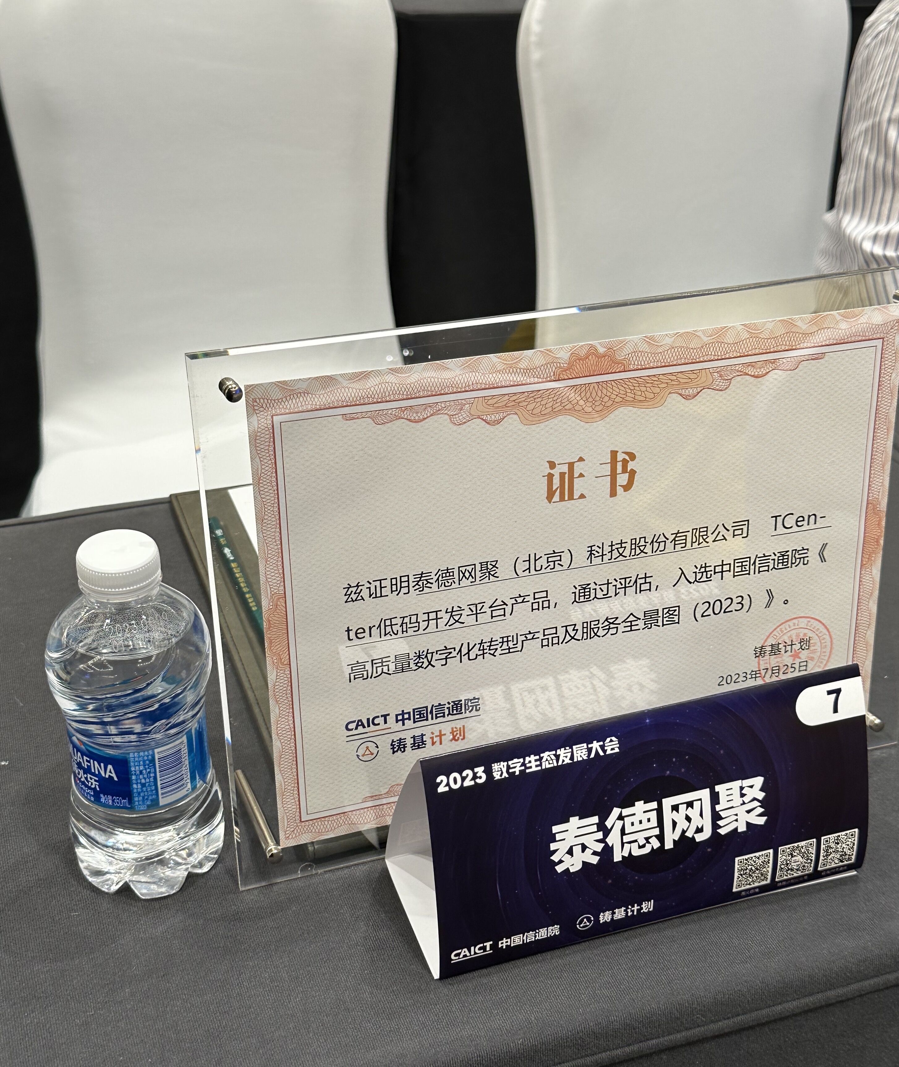 会议上,备受瞩目的一项重要评选 ——“高质量数字化转型产品及服务全景图” 正式发布。泰德网聚喜获殊荣,其旗下的TCenter低码开发平台凭借其在产品创新、服务质量、用户体验等多方面的突出表现成功入选该图谱。