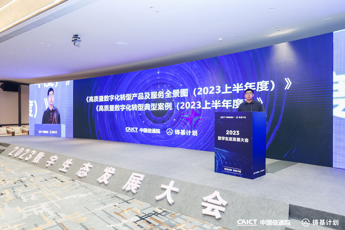 (图:中国信通院泰尔终端实验室数字生态发展部工程师曹海啸发布《高质量数字化转型产品及服务全景图(2023)》)